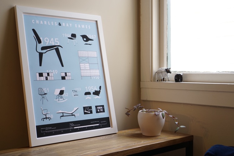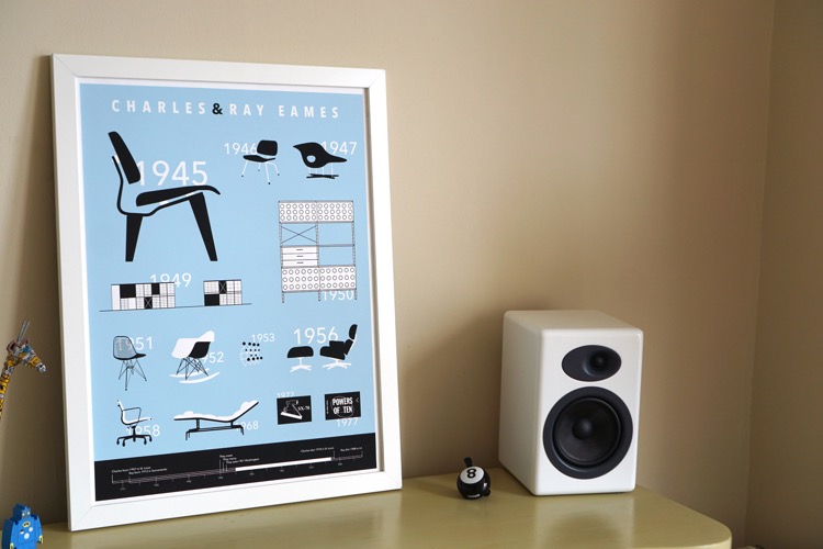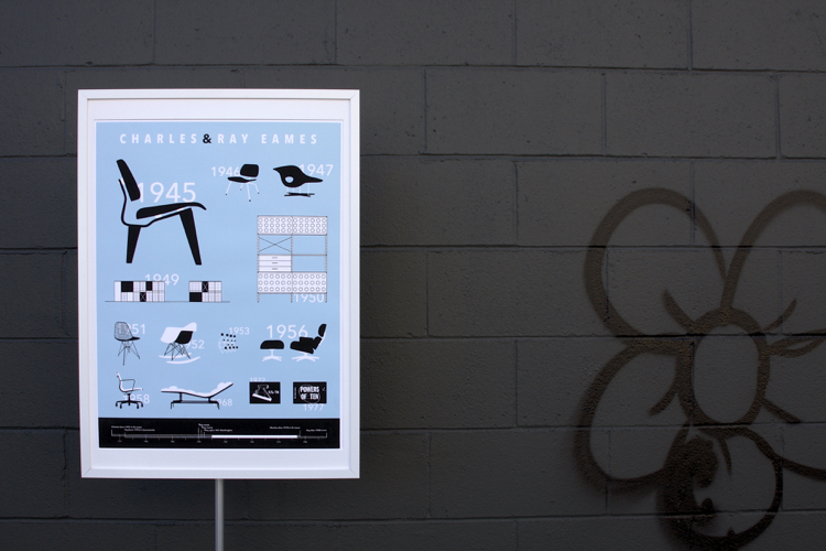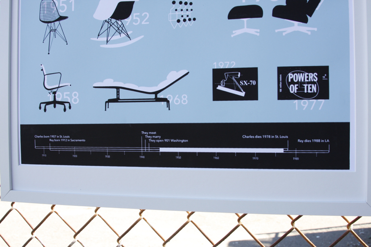 The Charles and Ray Eames poster I designed features a 13 piece chronology of their most iconic works along with a timeline of their lives together. In creating this poster I hope that it’s owners would reflect upon the Eameses productivity and the length of their career, but it is finite nonetheless.
